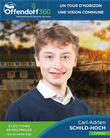 Souhaitant m’impliquer dans la vie de la commune, je désire aujourd’hui mettre mon regard de jeune et mes connaissances universitaires au service d’Offendorf. Mon objectif est de contribuer aux projets communaux et de favoriser une participation plus active des jeunes à la vie locale.